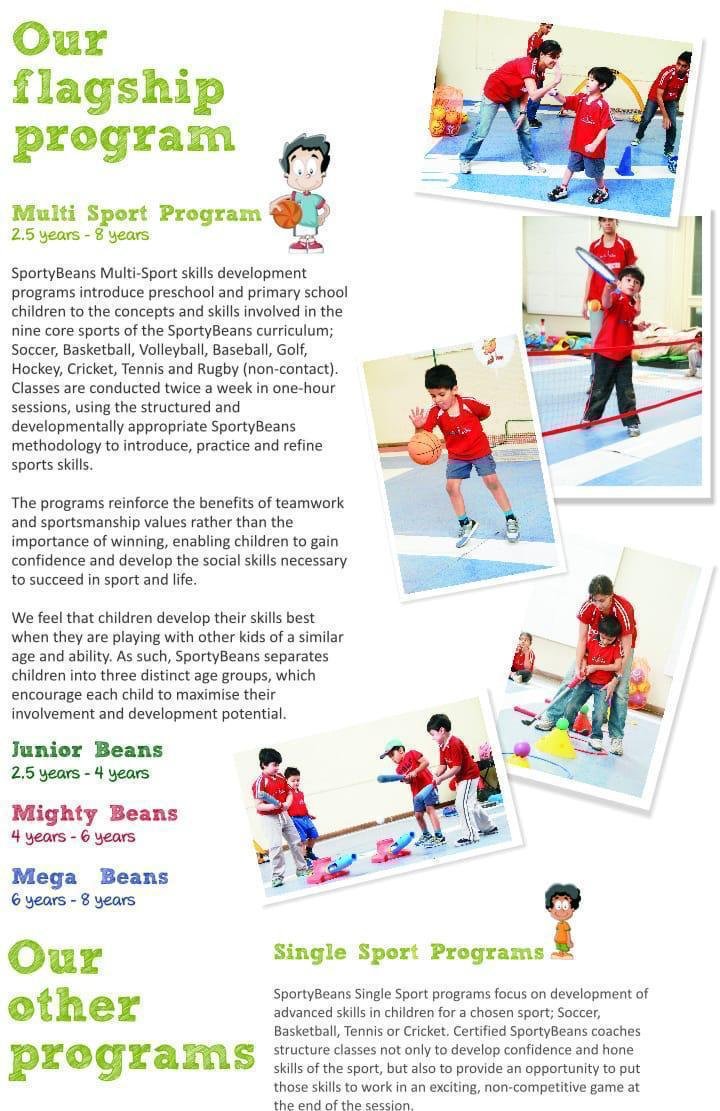 Multi Sport Program (2.5 years – 9 years)SportyBeans Multi-Sport skills development programs introduce preschool and primary school children to the concepts and skills involved in the nine core sports of the SportyBeans curriculum: Soccer, Basketball, Volleyball, Baseball, Golf, Hockey, Cricket, Tennis, and Rugby (non-contact).Classes are conducted twice a week in one-hour sessions, using the structured and developmentally appropriate SportyBeans methodology to introduce, practice, and refine sports skills.The program reinforces the benefits of teamwork and sportsmanship, enabling children to gain confidence and develop the basic skills necessary to succeed in sport and life.We feel children develop their skills best when they are playing with other kids of a similar age and ability. As such, SportyBeans has separate and age-defined distinct program groups, which encourage each child to maximise their involvement and development potential.Junior Beans (2.5 years – 4 years)Mighty Beans (4 years – 6 years)Mega Beans (6 years – 9 years)Single Sport ProgramsSportyBeans Single Sport programs focus on development of advanced skills in children for a chosen sport: Soccer, Basketball, Tennis or Cricket.Certified SportyBeans coaches structure classes to build strong technique and hands-on skills in the sport, but also to provide an opportunity to apply those skills to work in an active, non-competitive game at the end of the session.