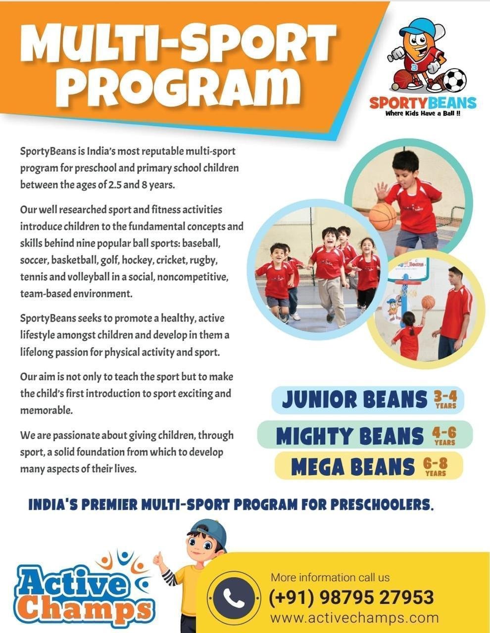 SportyBeans – Where Kids Have a Ball!SportyBeans is India’s most reputable multi-sport program for preschool and primary school children between the ages of 2.5 and 8 years.Our well-researched sport and fitness activities introduce children to the fundamental concepts and skills behind nine popular ball sports:Baseball, Soccer, Basketball, Golf, Hockey, Cricket, Rugby, Tennis, and Volleyball — all delivered in a social, non-competitive, team-based environment.SportyBeans aims to promote a healthy, active lifestyle among children and help them develop a lifelong passion for physical activity and sports.Our goal is not just to teach sports, but to make a child’s first introduction to sport exciting and memorable.We are passionate about giving children a strong foundation through sport, helping them grow confidence, coordination, teamwork, and essential life skills.Age-wise GroupsJunior Beans: 3–4 yearsMighty Beans: 4–6 yearsMega Beans: 6–8 years India’s Premier Multi-Sport Program for PreschoolersFor more information:📞 (+91) 98795 27953🌐 www.activechamps.com