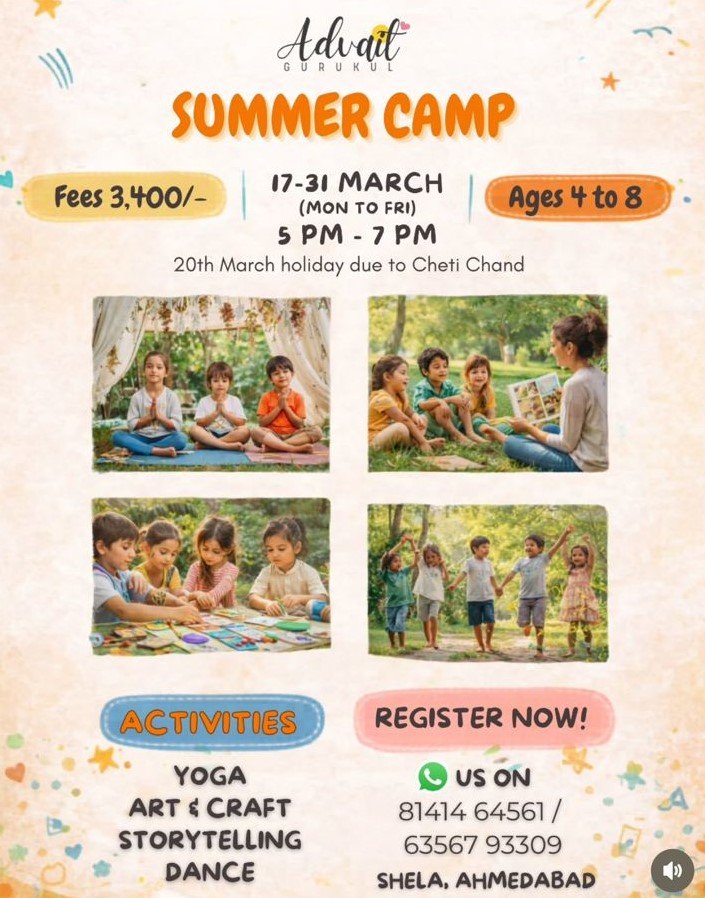 Hello! 😊📍 Location: Shela, Ahmedabad✨ Activities include:* Yoga* Art & Craft* Storytelling* DanceThe camp focuses on joyful learning, creativity, movement, and meaningful group activities in a calm, nature-friendly environment.Limited seats to maintain a small group.Let me know if you'd like to reserve a spot for your child. 🌿