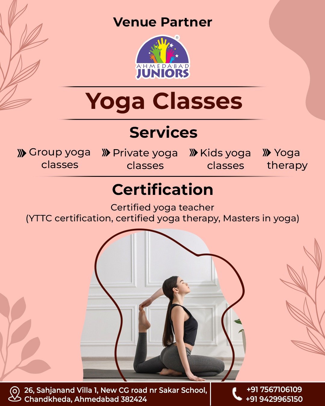 ServicesGroup yoga classesPrivate yoga classesKids yoga classesYoga therapy CertificationCertified Yoga Teacher(YTTC certification, certified yoga therapy, Masters in yoga)π Address:26, Sahjanand Villa 1, New CG Road, near Sakar School, Chandkheda, Ahmedabad β 382424π Contact:+91 75670 61019+91 94299 65150