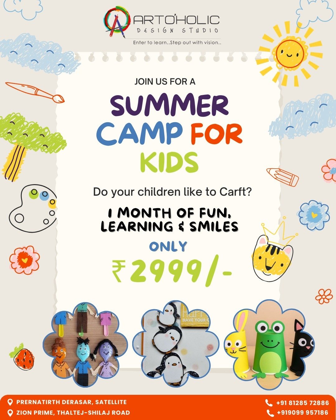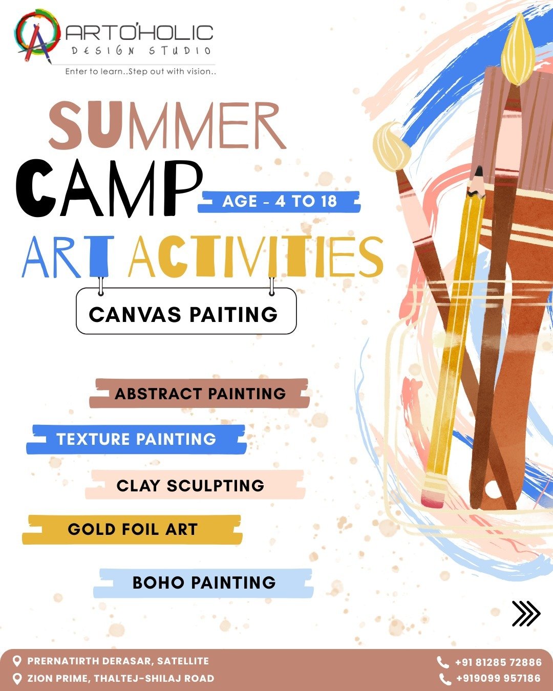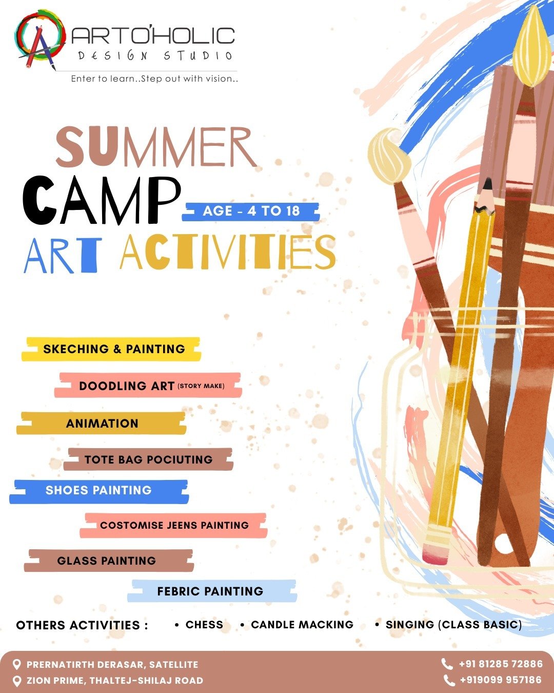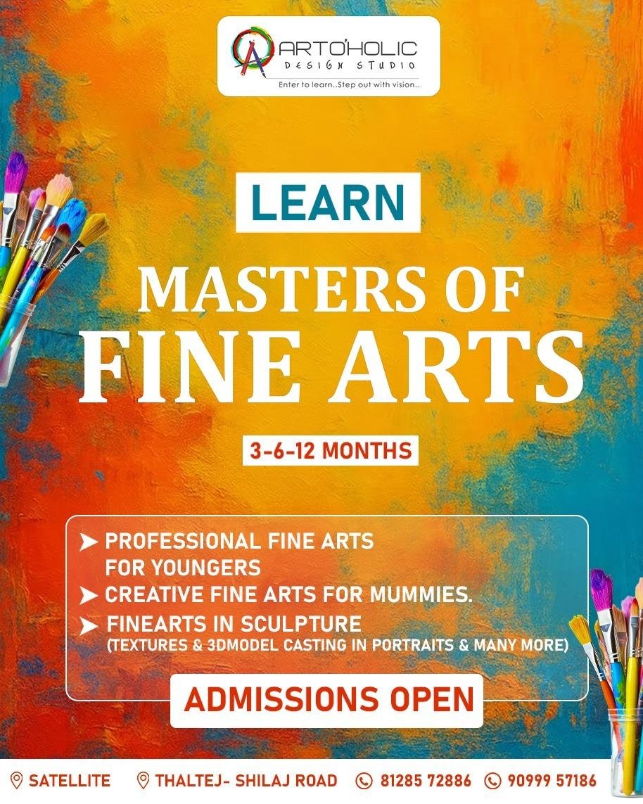 The Artoholic Design Studio established in 2013 is an Art School in Satellite which supports artists and promotes engagement with the visual arts through a range of inclusive activities: Canvas Party, Exhibitions, Workshops, Birthday Parties, Festival Celebration and Demonstration. Interior customize painting & artwork we do.kind of any style of art. Artohlicdesign Studio owns and runs its own Gallery, Classes and Parties. The Artoholic Design Studio located in prernatirth derasar satellite, jodhpur gaam area. The Artoholic Design Studio provides the various activities in visual arts,(i.e. Drawing, painting, pencil, charcoal, watercolour)Portfolio Consultancy, Calligraphy&handwriting improvement, Canvas Painting, Finarts in masters( painting ,sculpture) Art & Craft.