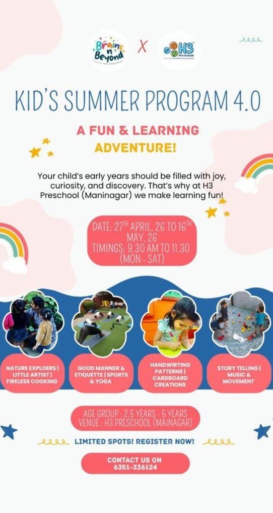 Greetings for the day!Looking for a meaningful and fun way to keep your child engaged this summer? 🌞We are happy to introduce our Fun Summer Vacation Program — thoughtfully designed to help children learn, explore, and grow while enjoying every moment!✨ Why join?✔ Builds creativity, confidence, and curiosity✔ Encourages healthy habits and social skills✔ Keeps children active and away from screens✔ A perfect mix of learning + fun!🌈 9 Exciting Themes:Nature Explorer | Little Artists | Wonders of Science | Food Around Us | Handwriting Patterns | Good Manners & Etiquette | Sports & Yoga | Cardboard Creations | Aqua Fun & much more!