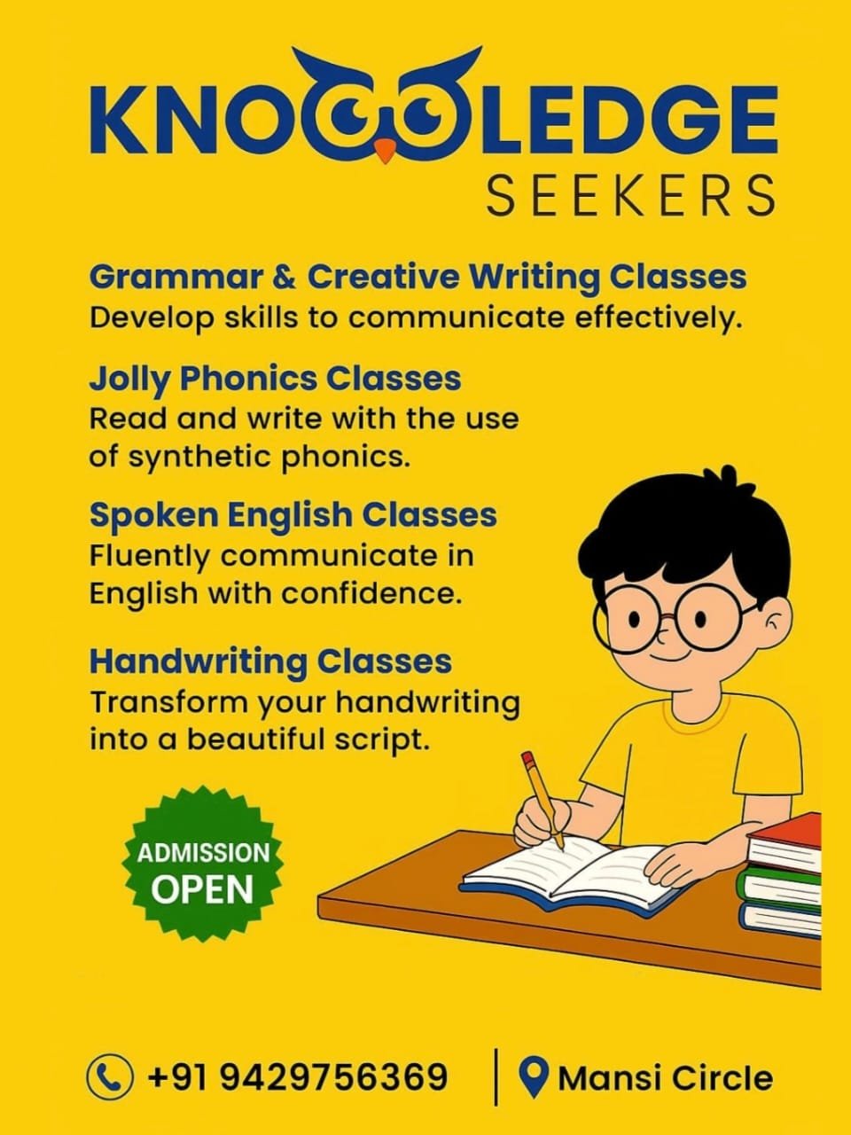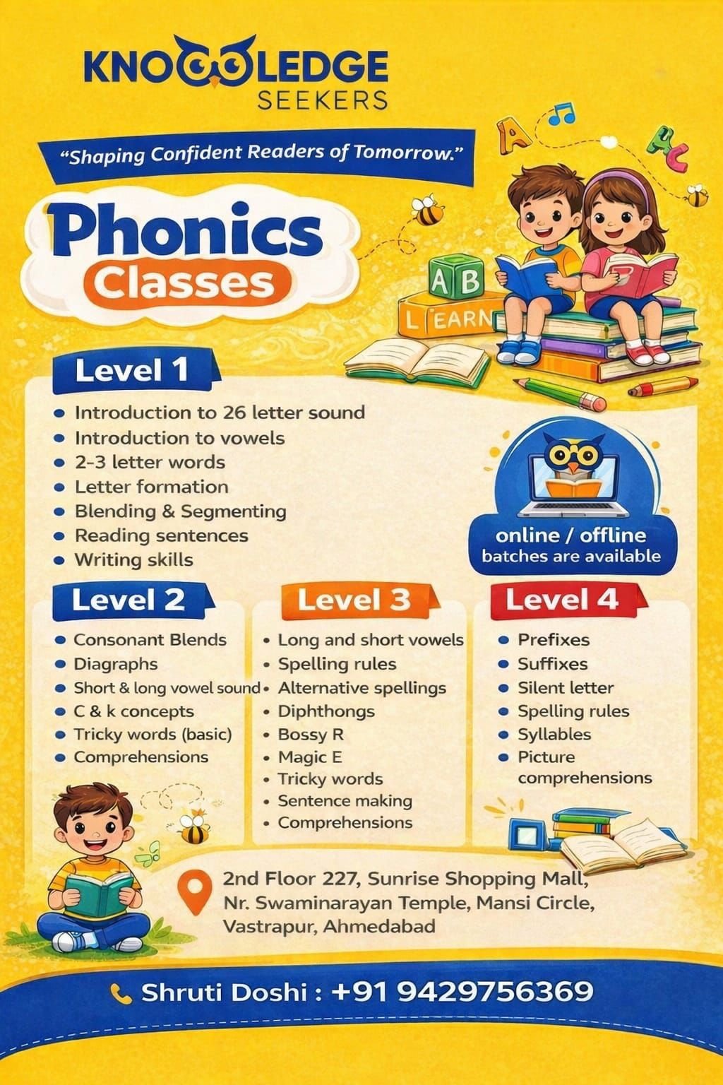 Grammar & Creative Writing ClassesDevelop skills to communicate effectively.Jolly Phonics ClassesRead and write with the use of synthetic phonics.Spoken English ClassesFluently communicate in English with confidence.Handwriting ClassesTransform your handwriting into a beautiful script.