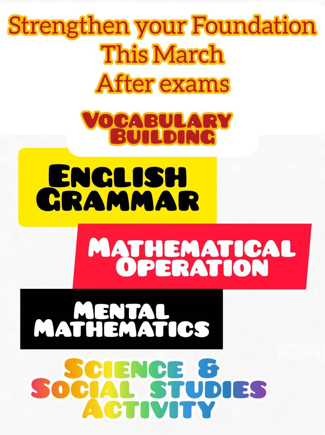 English grammar classes, Mental Mathematics development & Social science activity classes