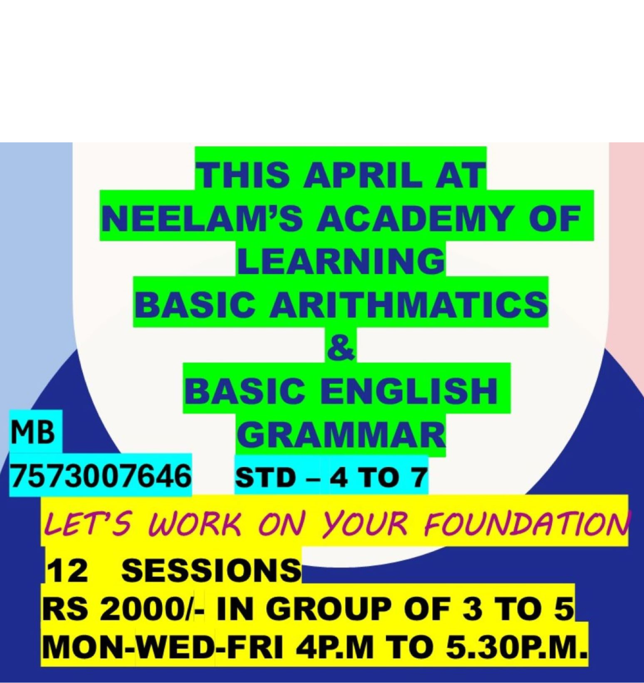 This April Let's develop your Basic Arithmetic and Basic English grammar Contact 7573007646