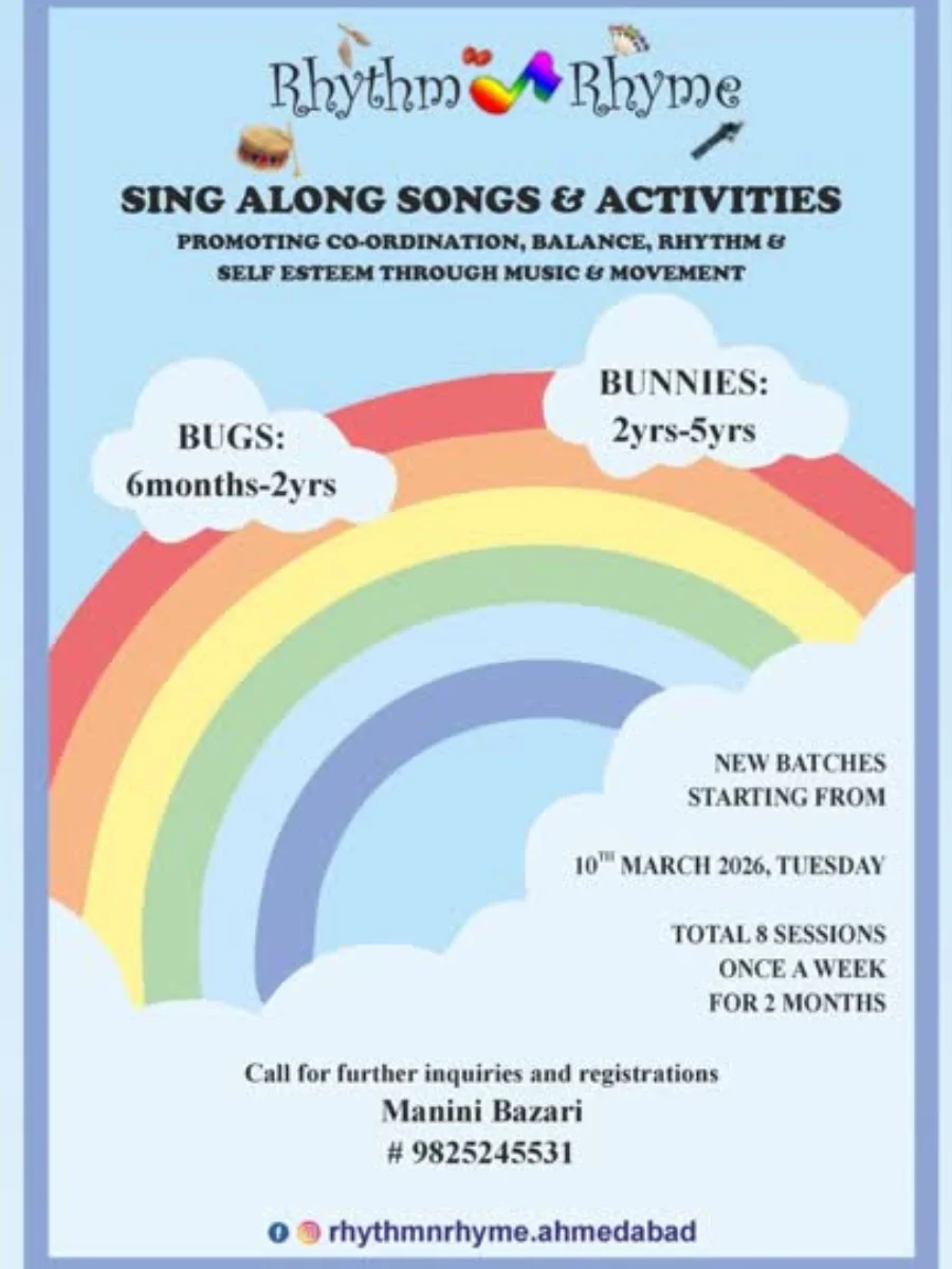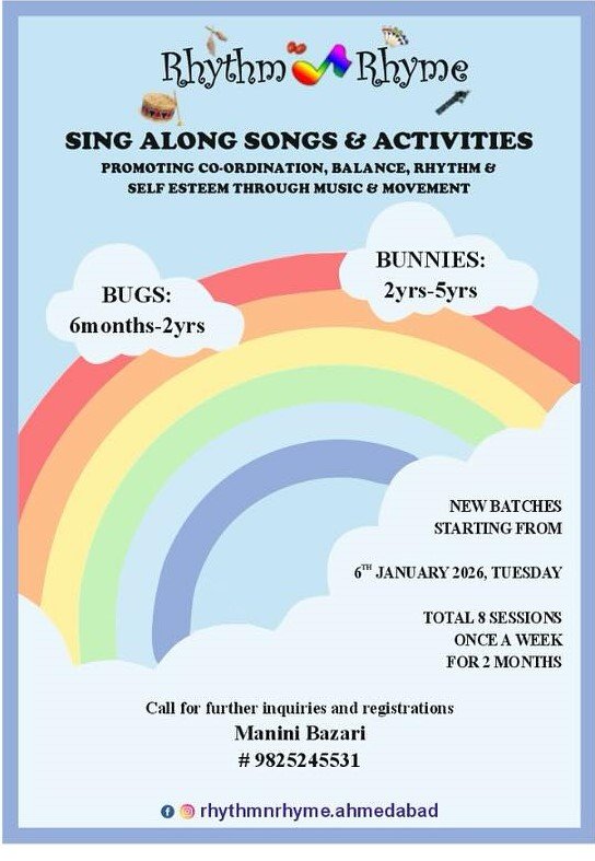🌞 Summer Workshop 2026📚 Bookworm & Rhythm & RhymeGive your child a joyful, creative, and confidence-building summer! This thoughtfully designed workshop blends learning + fun through interactive activities that nurture imagination, expression, and social skills.🎯 What Kids Will Experience✨ Storytelling:Builds imagination, listening skills & vocabulary through engaging stories🎵 Music & Movement:Rhythm-based activities to improve coordination, expression & energy release🎨 Art & Craft:Hands-on creativity to develop fine motor skills and self-expression🧠 Key Benefits✔ Boosts creativity & imagination✔ Improves communication & confidence✔ Enhances social interaction with peers✔ Encourages independent thinking✔ Screen-free, engaging learning environment🎁 Additional Highlights🌟 Small batch size for personal attention🌟 Safe & child-friendly environment🌟 Guided by experienced facilitators🌟 Fun + learning balance (no pressure learning)From: 4thMay - 8thMay📍 Venue:21, Seema SocietyBehind Memnagar Fire StationNavrangpura, Ahmedabad From: 11thmay-15thmay📍 Venue:Iscon ambali road
