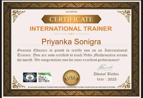 Priyanka “Pinky” Sonigra is the founder of Vedic Maths with Pinky, with 8+ years of experience teaching children how to make maths simple, fast, and fun. I have trained 300+ students using powerful Vedic Maths techniques that improve mental calculation, concentration, and confidence in numbers.