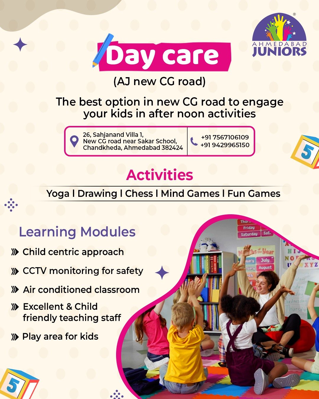 The best option in new CG road to engage your kids in afternoon activities Activities Yoga | Drawing | Chess | Mind Games | Fun Games Learning Modules β Child centric approach β CCTV monitoring for safety β Air conditioned classroom β Excellent & child friendly teaching staff β Play area for kids π Address: 26, Sahajanand Villa 1, New CG Road near Sakar School, Chandkheda, Ahmedabad 382424 π Contact: +91 75671 06109 , +91 94298 65150