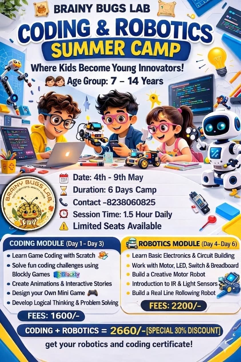 🌟 Brainy Bugs Lab – Summer Camp 2026 🌟Dear Parents,Give your child a fun & learning-filled summer with our exciting camp! 🚀🔹 4th – 9th May (Age 7–14)💻 Coding & Robotics Camp⏰ Time: 10:00 – 11:30 A.M.* Module 1: Coding – ₹1600/-* Module 2: Robotics – ₹2200/-* Combo (Coding + Robotics) – ₹2660/-🔹 11th – 14th May (Age 6–12)🔬 Science Experiments & Model Making* Module 3 – ₹999/-🎯 All 3 Modules Combo: ₹3500/-⚠️ Limited Seats Available✅ Registration Compulsory❌ Fees are Non-Refundable📞 Contact: 8238060825Let your child learn, create & explore science in a fun way! ✨