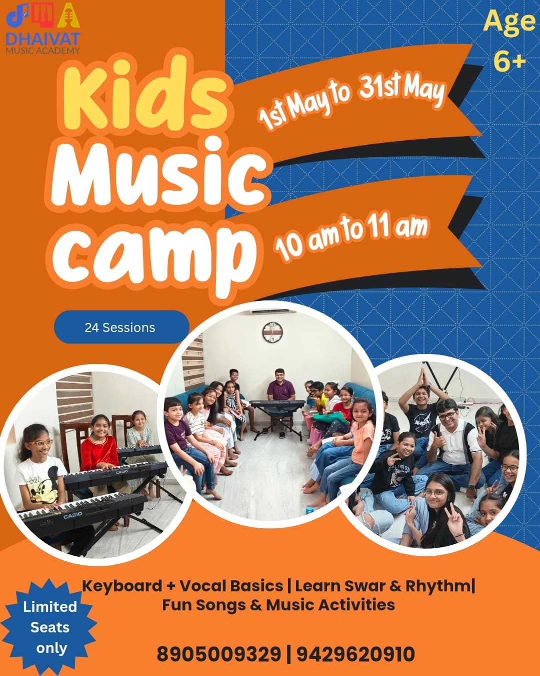 🎵 Kids Music CampEligibility: Basic English reading requiredLocation: 1, sopan flat, 24, Gujarat Society, opp. Indian red cross Blood Bank, Paldi, Ahmedabad Contact No: 8905009329 |9429620910Registration:Registration is compulsory before 5th April by completing the payment procedure.✨ A fun and structured introduction to music through keyboard, vocal practice, rhythm and songs.