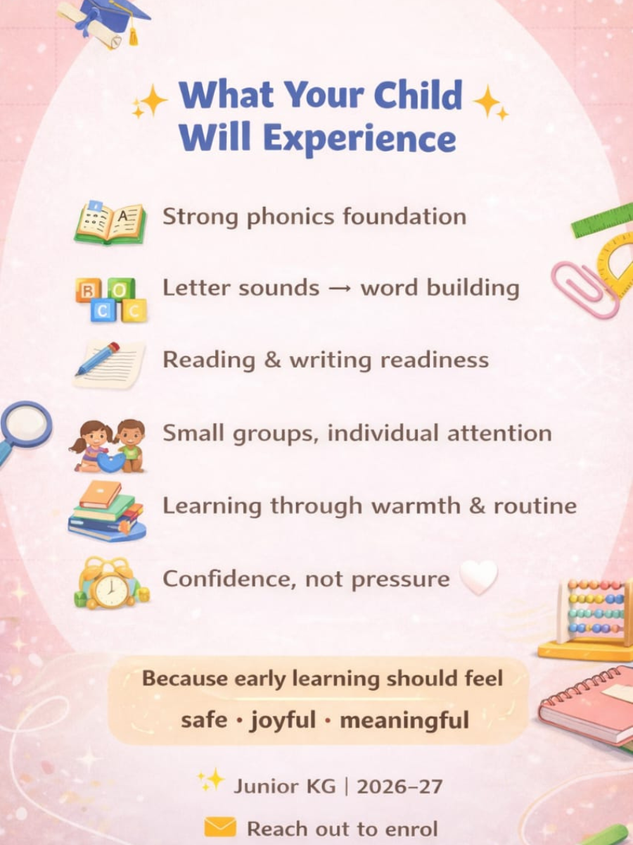 📖 Strong phonics foundation🔤 Letter sounds → word building✏️ Reading & writing readiness👧👦 Small groups, individual attention📚 Learning through warmth & routine⏰ Confidence, not pressure 🤍Because early learning should feelsafe • joyful • meaningful