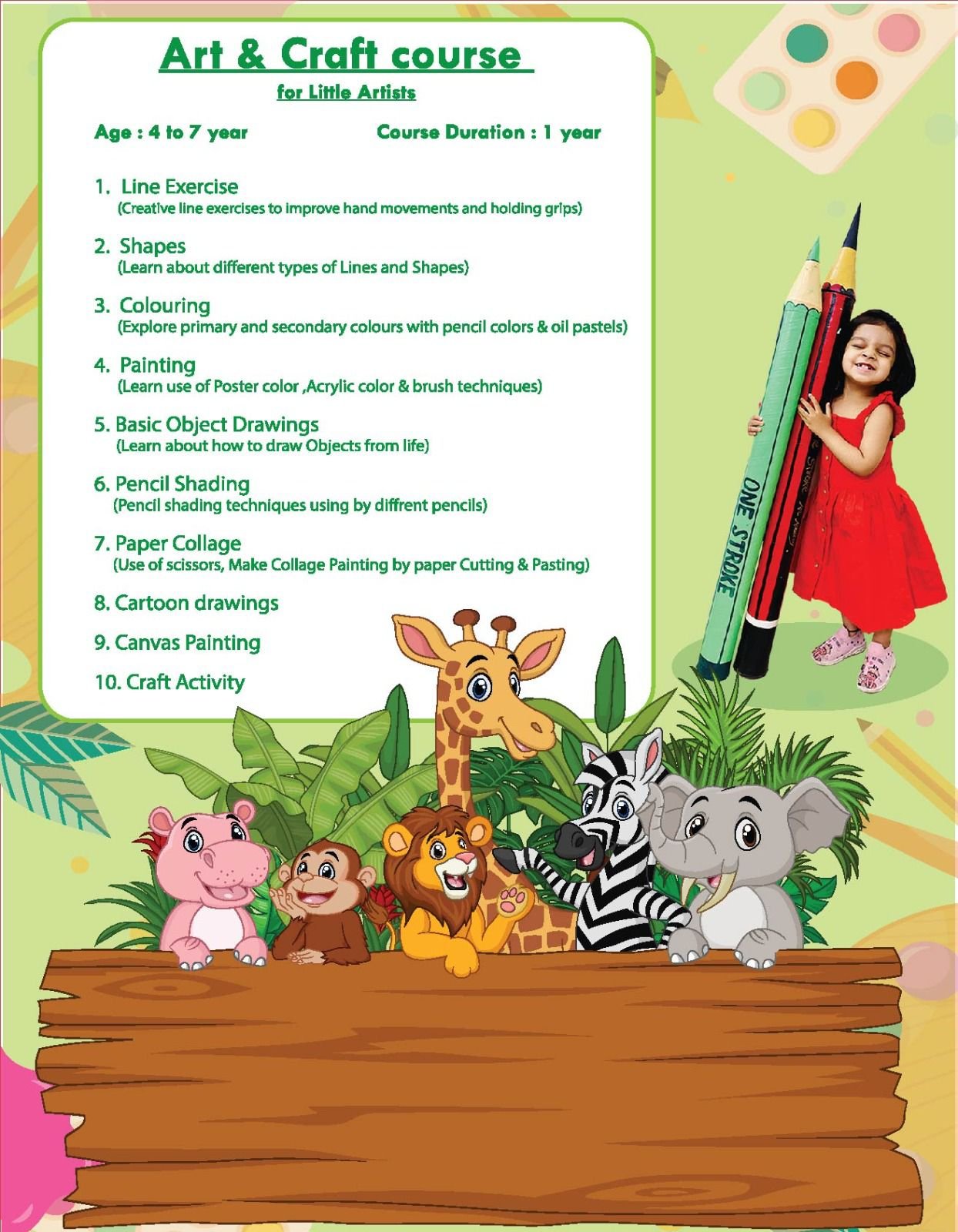 Basic Line Exercise(Creative line exercises to improve hand movements and holding grip)Basic Drawing & Shapes(Learn about different types of lines and shapes)Colouring(Use of pencil colors & oil pastels)Cartoon Drawing(Step-by-step cute animals & cartoon characters)Art Activities(Paper collage art, clay art, dot painting)Colour Theory(Introduction about primary & secondary colour names)Basic Object Drawing(Learn how to draw objects from life)Painting(Learn use of poster color, acrylic colors & brush techniques)Nature Art(Learn how to draw objects from life)Learn about two-colour shading(Learn colour blending techniques with two colors)Course Outcome:By the end of 1 year, kids will develop:• Fine motor skills• Creativity & imagination• Color sense & coordination• Confidence in drawing• Knowledge of multiple art mediums• Ability to create their own ideas