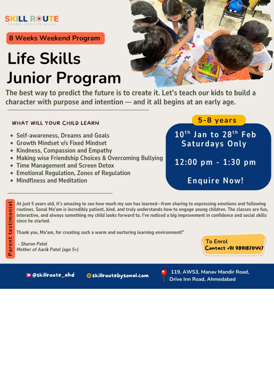 Weekend Life Skills ProgramThe best way to predict the future is to create it.Let’s teach our kids to build a character with purpose and intention — and it all begins at an early age.🧠 What Will Your Child Learn?Self-awareness, Dreams & GoalsGrowth Mindset vs Fixed MindsetKindness, Compassion & EmpathyMaking wise friendship choices & overcoming bullyingTime management & screen detoxEmotional regulation & zones of regulationMindfulness & meditation 🧡 Parent Testimonial“At just 5 years old, it’s amazing to see how much my son has learned — from expressing emotions to building confidence. The sessions are interactive and nurturing. Highly recommended!”— Sharon Patel, Parent📍 Venue119, AW3, Manav Mandir Road, Drive-In Road, Ahmedabad📞 To EnrollContact: +91 98980 74497