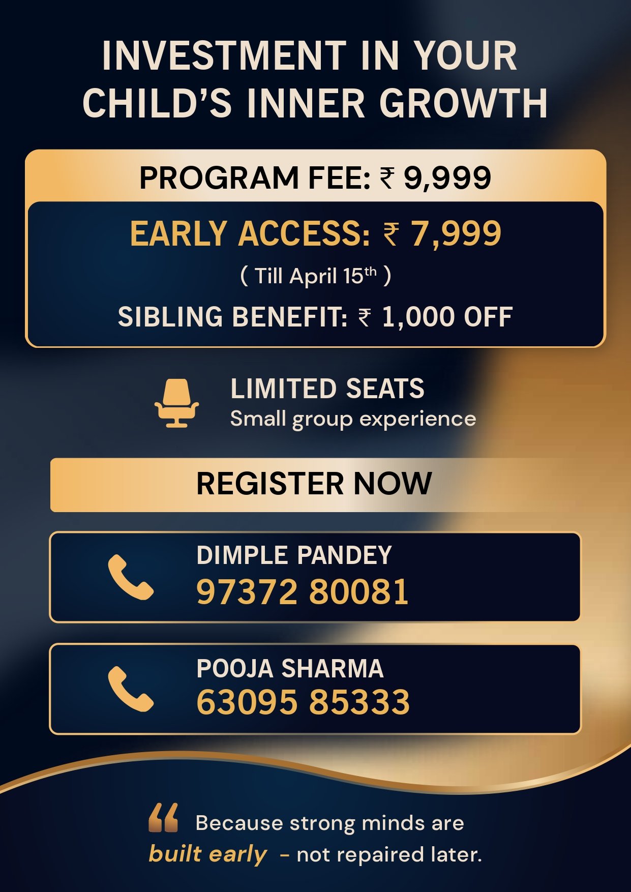 🌟6-Day Public Speaking Crash Course for Kids! 🌟Give your child the ultimate confidence boost to speak, express & shine! ✨🎤📅 *Dates: 20th to 25th April*Course Fees: INR 3000/-In just 6 power-packed days, your child will learn:✨ Creative Introductions✨ Fundamentals of Powerful Speaking✨ Storytelling in their own unique style✨ Impromptu Speaking & Quick Thinking*Why Join?*🌈 Builds confidence🌈 Enhances expressions & creativity🌈 Prepares kids for the stage📣 Limited seats!Call / DM to Register – 96013 14884Let your child discover the joy of speaking with confidence! 💛🎙️