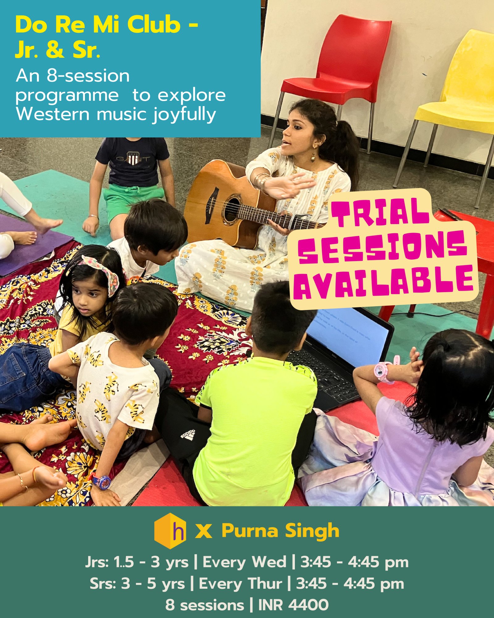 is a 8 week course for young kids on Western Vocals & Music. This course is a playful relationship building with the basics of music. It will instill a seed of music in kids, while they enjoy being engaged in English and Hindi classics and musical rhythm games. Here’s what will be covered in the course: 1. Solfege – Learning how to sing Do re mi fa so la ti do, through movement. There will be songs and games through which their understanding of the musical alphabet will be strengthened. They will also be learning the solfege hand signs. 2. Songs – They will be introduced to over 8 songs - English as well as some Hindi classics (not rhymes). These will be taught with visual cues, movement and actions. The content will be a mix of fun as well as musical enriching songs that will in turn ensure an understanding of basic musical concepts. 3. Rhythm, Beats and Movement – They will learn about beats and rhythm through songs, games and movement based activities. This will also include learning basic and intermediate rhythm syllables. This will strengthen their understanding of timing as well as mixing song and rhythm/movement. They will also work with simple percussion instruments like shakers, tambourine etc. COURSE DELIVERABLES 1. Each week material covered in class will be shared with parents. Links of songs taught as well as additional material in form of recorded audio pieces and videos will be shared where necessary. 2. Photos and short video clips of kids from class will be shared every week.