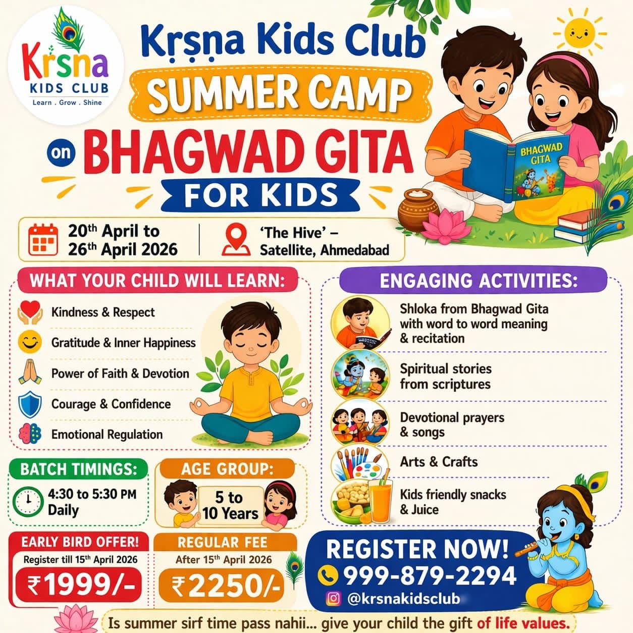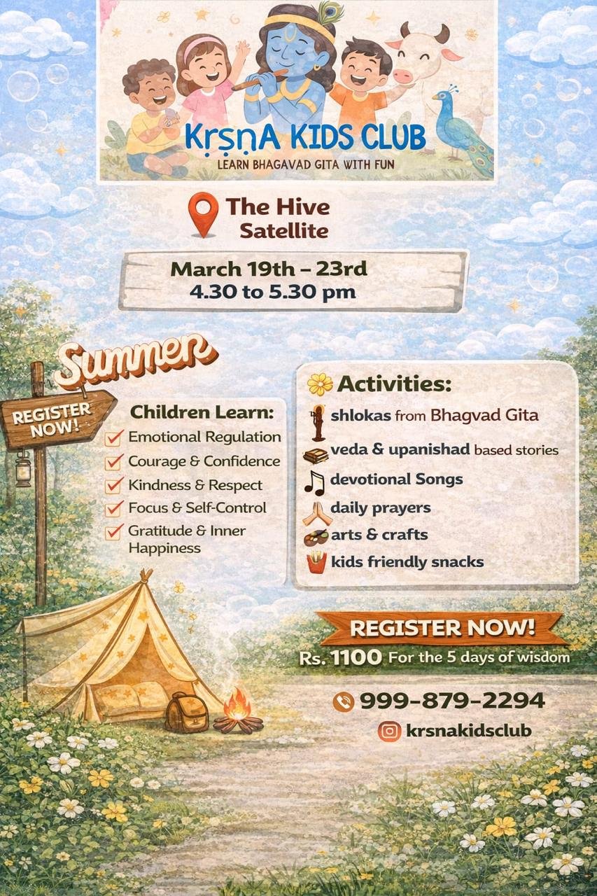 🌼 A summer of stories, values & joyful learning!Introduce your child to the timeless wisdom of the Bhagwad Gita — made simple, engaging, and fun for young minds 🌿✨At Krsna Kids Club Summer Camp, children explore life values through stories, shlokas, music, and hands-on activities 💛✨ What children will learn:* Kindness & respect* Gratitude & inner happiness* Courage & confidence* Emotional regulation* Faith & devotion🎨 Engaging activities include:* Shlokas with meaning & recitation* Stories from scriptures* Devotional songs & prayers* Arts & crafts* Snacks & juice📅 Dates: 20th – 26th April 2026⏰ Time: 4:30 – 5:30 PM (Daily)💰 Fees:* Early Bird: ₹1999 (till 15th April)* Regular: ₹2250⚡ Limited seats📩 To register, DM/WhatsApp: +91 99987 92294