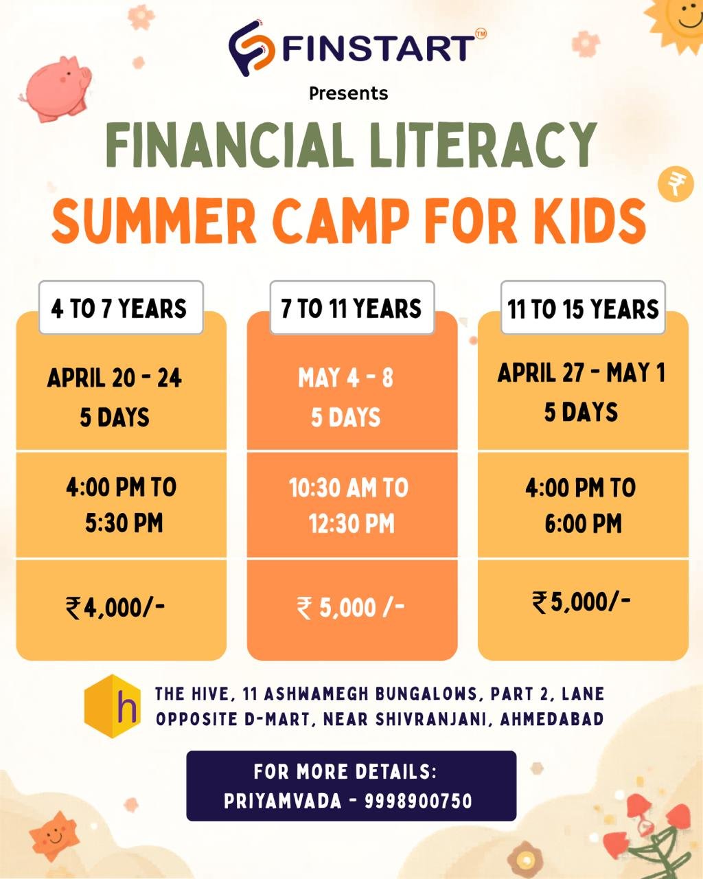 Finstart is back with their Summer Camps —this time bigger, better, and packed with fun learning!This year, we have 3 exciting programs for different age groups:✨ 4–7 years✨ 7–11 years✨ 11–15 yearsFrom earning to saving to smart spending—to investing kids will learn money concepts through games, activities, and real-life experiences📅 Limited seats for each batch📞 For more details - Priyamvada: 9998900750