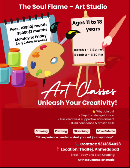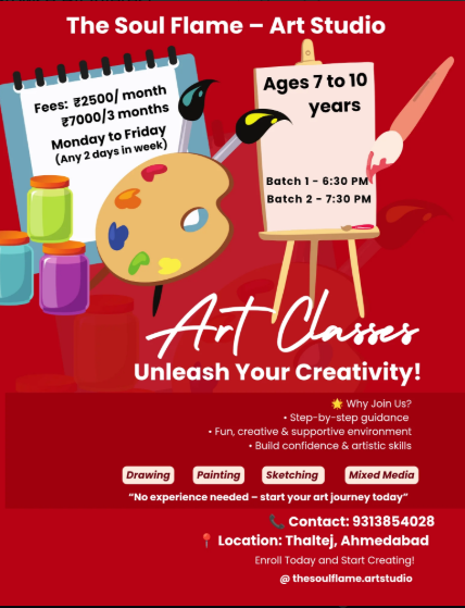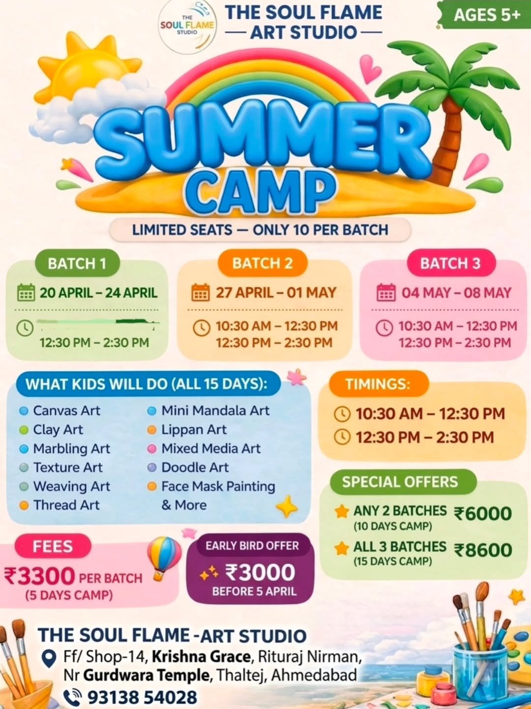 🎨 THE SOUL FLAME – Art Studio🌈 Summer Art Program 2026✨ Give your child a joyful space to create, explore & express this summer!📅 Batch 1: 20 – 24 April⏰ 12:30 PM – 2:30 PM🖌 Canvas Painting🧵 Weaving Art🎨 Tote Bag Painting🏺 Terracotta Tray Painting✨ Texture Art📅 Batch 2: 27 April – 1 May⏰ 10:30 AM – 12:30 PM⏰ 12:30 PM – 2:30 PM🖌 Canvas Painting🧱 Clay Art🌊 Marbling Art✨ Texture Art🧶 Thread Art📅 Batch 3: 4 May – 8 May⏰ 10:30 AM – 12:30 PM⏰ 12:30 PM – 2:30 PM🌸 Mini Mandala Art🪔 Lippan Art🎭 Mixed Media Art🏺 Pot Painting🎭 Face Mask Painting✨ Fun • Creative • Beginner Friendly🎨 All Materials Included💰 Fees:₹3300 – Any 1 Batch (5 Days)₹6000 – Any 2 Batches (10 Days)₹8600 – Full Program (15 Days)⚠️ Pre-registration compulsory📍 Thaltej, Ahmedabad📞 Call/WhatsApp: 9313854028